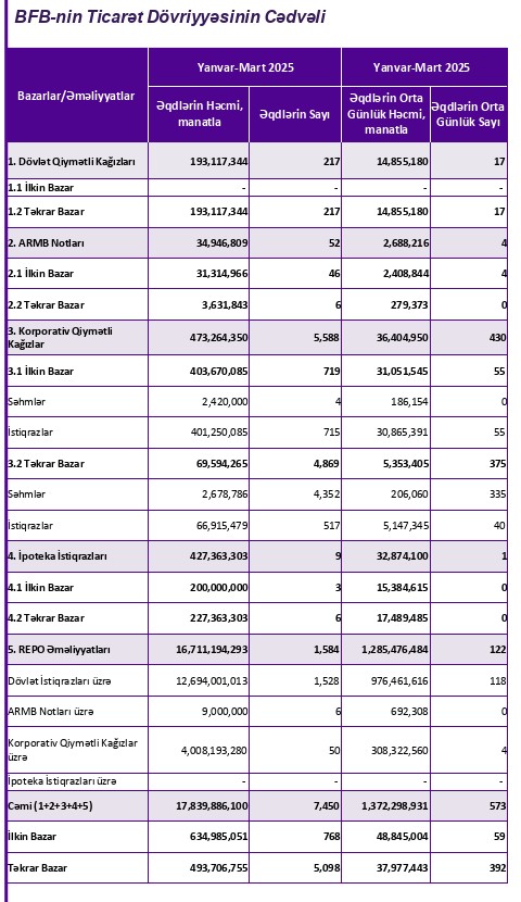 BFB-nin dövriyyəsinin 93,7 %-i və yaxud 16 milyard 711 milyon 194 min manatı repo əməliyyatlarının payına düşüb. Bu, illik müqayisədə 3,4 dəfə çoxdur.2025-ci ilin ilk 3 ayında (yanvar-mart) Bakı Fond Birjasında (BFB) ticarət dövriyyəsinin həcmi 17 milyard 839 milyon 886 min manat təşkil edib.