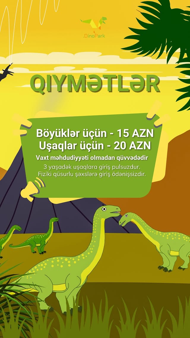 Bilet bütün gün üçün keçərlidir. Ərazidə mövcud olan bütün attraksionlar qiymətə daxildir. Ərazidə 20-dən çox hərəkət edən və səs çıxaran dinozavr mövcuddur. Ən böyük dinozavrın hündürlüyü 9,5 metrdir.