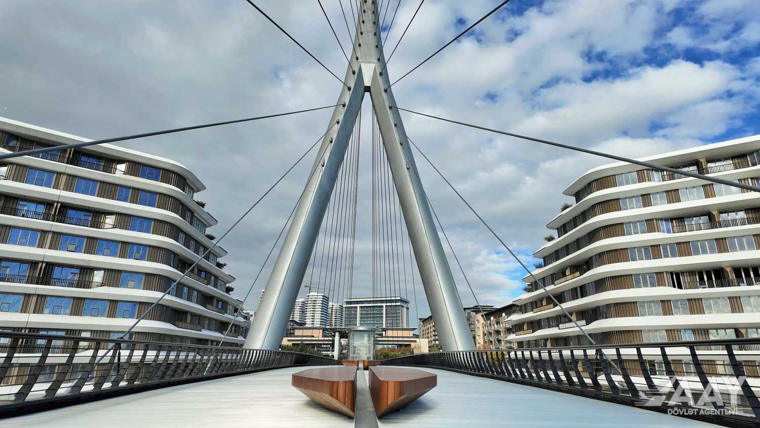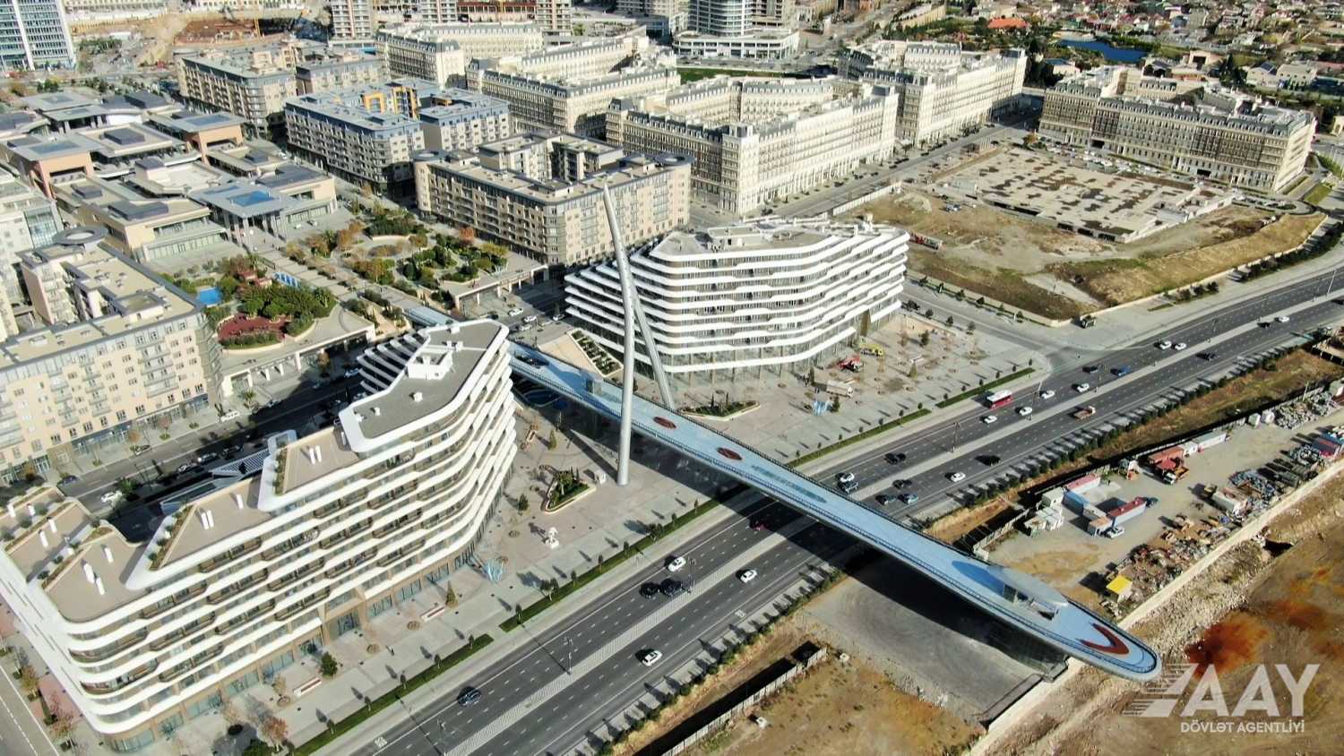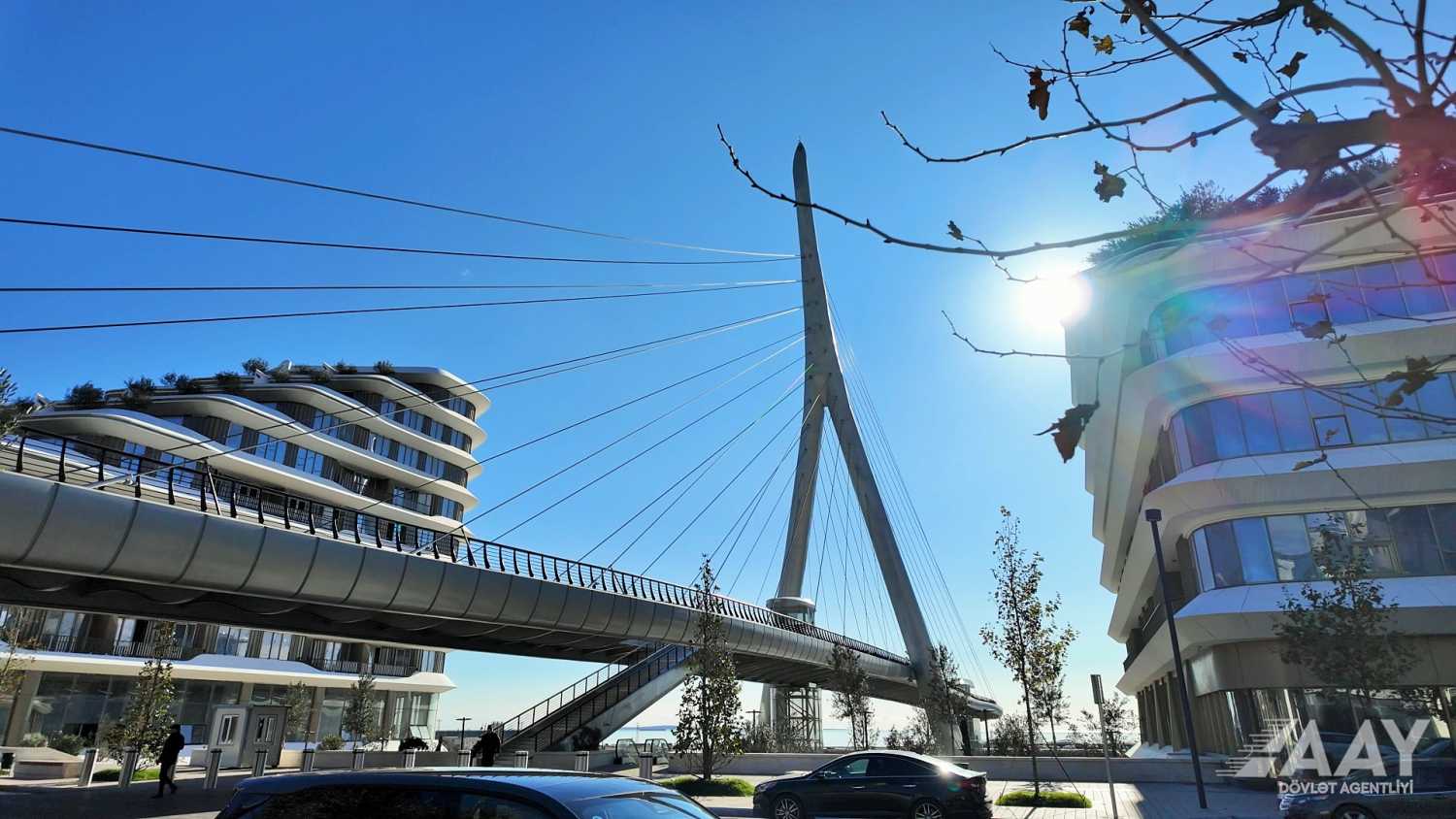 “Bakı Ağ Şəhər” yol infrastrukturunun yenidən qurulması layihəsi çərçivəsində 8 Noyabr prospekti üzərindən Bakı “Ağ Şəhər” layihəsinin Fəvvarələr meydanı parkını və Ağ Şəhər Bulvarını birləşdirən metal konstruksiyalı, müasir arxitekturaya malik yerüstü piyada körpüsü inşa edilib.