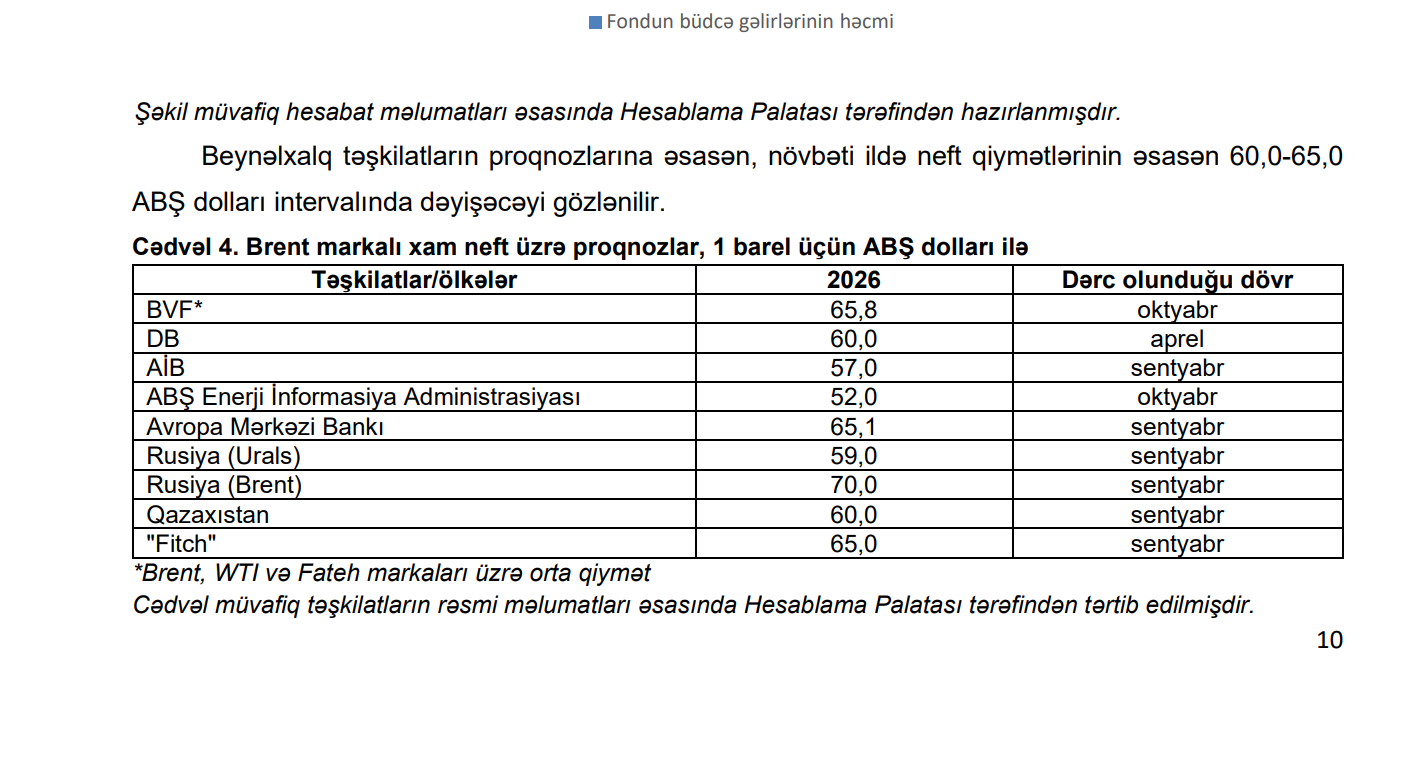 Beynəlxalq maliyyə institutlarının “Brent” markalı xam neft üzrə 2026-cı il proqnozlarının əsasən 60–65 ABŞ dolları intervalında dəyişəcəyi gözlənilməsi fonunda, Azərbaycan Respublikası Dövlət Neft Fondu büdcəsinin baza ssenarisini konsensus diapazonun yuxarı həddi olan 65,0 ABŞ dolları qiymət fərziyyəsi əsasında proqnozlaşdırmışdır.