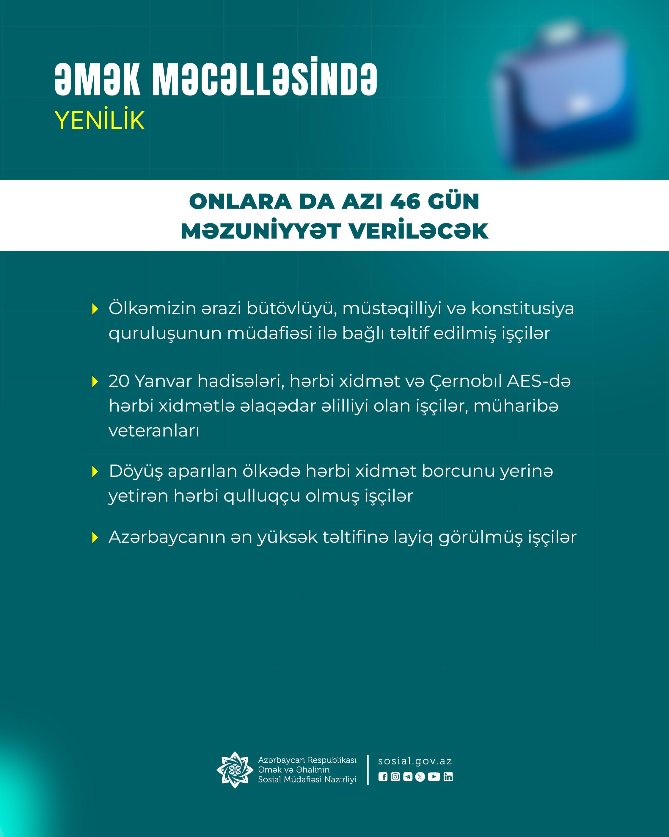 - Azı 46 təqvim günü əmək məzuniyyəti verilən işçilərin sırasına ölkəmizin ərazi bütövlüyü, müstəqilliyi və konstitusiya quruluşunun müdafiəsi ilə bağlı təltif edilmiş işçilər, 20 Yanvar hadisələri, hərbi xidmət və Çernobıl AES-də hərbi xidmətlə əlaqədar əlilliyi olan işçilər, müharibə veteranları olan işçilər, döyüş aparılan ölkədə hərbi xidmət borcunu yerinə yetirən hərbi qulluqçu olmuş işçilər və Azərbaycanın ən yüksək təltifinə layiq görülmüş işçilərin də daxil edilməsi,