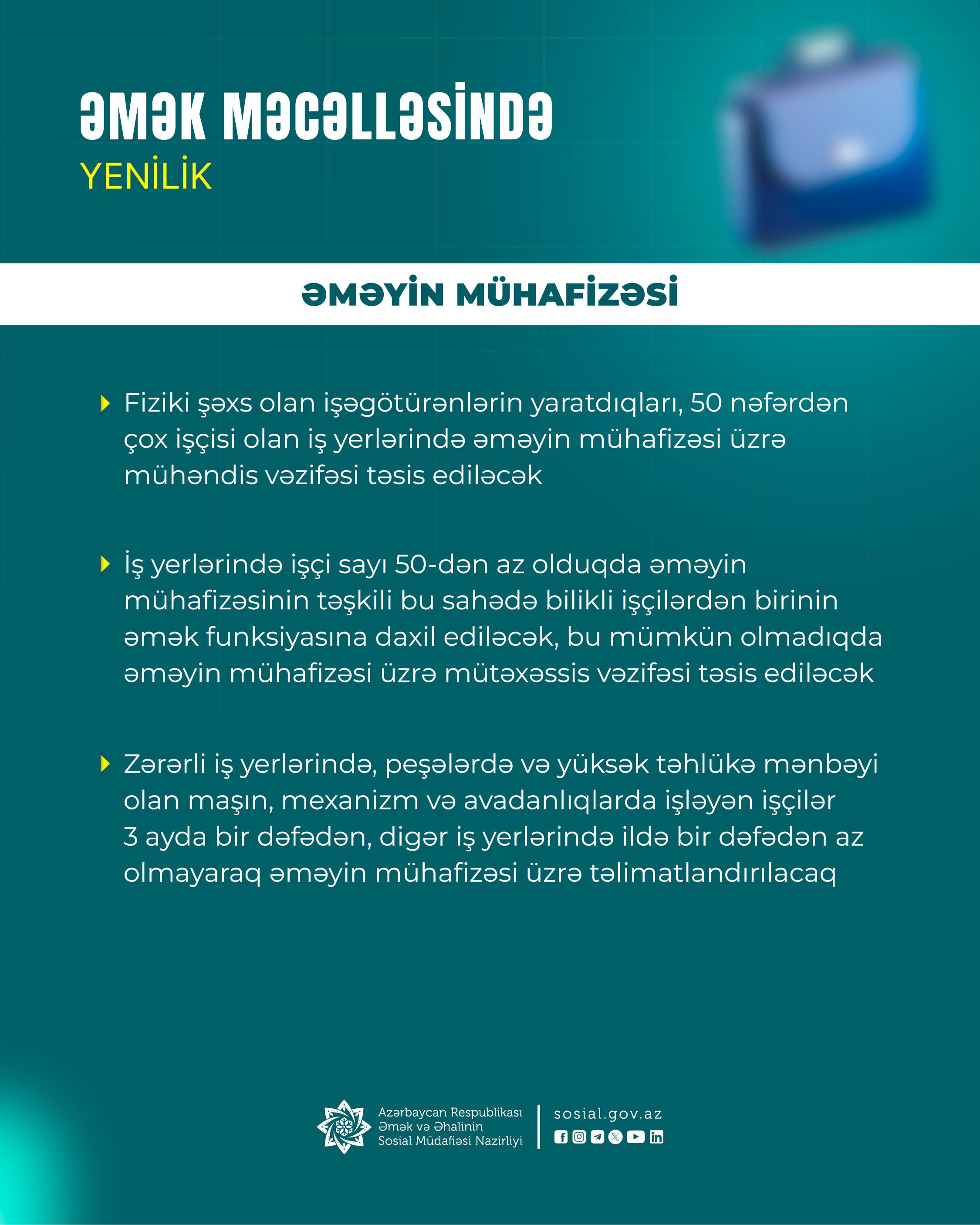 - Fiziki şəxs olan işəgötürənlərin yaratdıqları, işçilərin sayı 50-dən çox olan iş yerlərində əməyin mühafizəsi üzrə mühəndis vəzifəsinin təsis edilməsi,