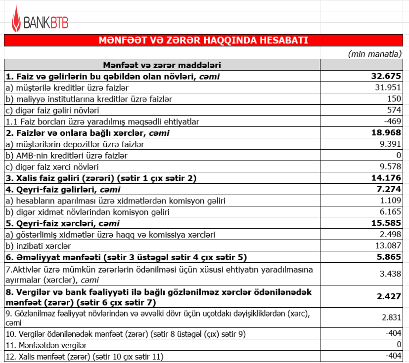 Marja.az xəbər verir ki, 2025-ci ildə “Bank BTB” 404 min manat xalis zərərlə fəaliyyət göstərib. Bu, 2024-cü ildə qeydə alınmış 839 min manat xalis zərlə müqayisədə 435 min manat və ya 51,9 faiz azalma deməkdir. Zərərin iki dəfəyə yaxın azalması Bankın əməliyyat səmərəliliyinin yüksəldiyini göstərir.