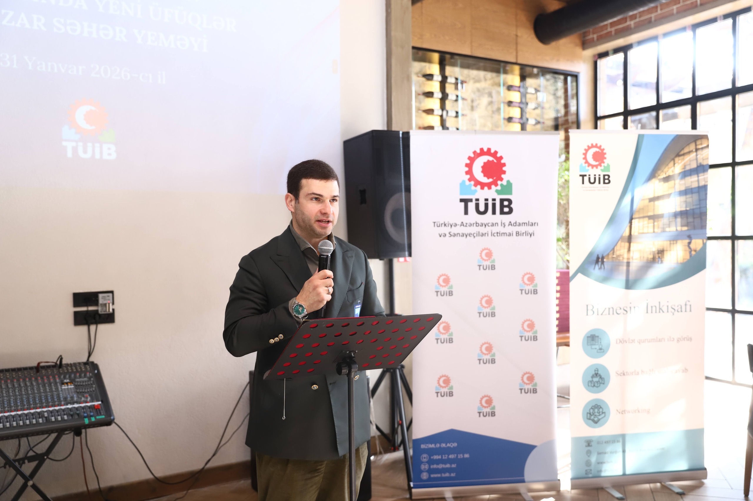 31 yanvar 2026-cı il tarixində TÜİB-in təşkilatçılığı ilə “Türkiyə–Azərbaycan iş dünyasında yeni üfüqlər” mövzusunda işgüzar səhər yeməyi təşkil olunub. Tədbirin məqsədi Azərbaycan və Türkiyə arasında iqtisadi əməkdaşlığın möhkəmləndirilməsi, iş dünyasının aktual məsələlərinin müzakirəsi və yeni tərəfdaşlıqların qurulması olub.