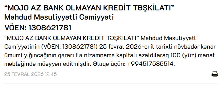 “MOJO AZ BANK OLMAYAN KREDİT TƏŞKİLATI” Məhdud Məsuliyyətli Cəmiyyətinin 25 fevral 2026-cı il tarixli növbədənkənar ümumi yığıncağının qərarı ilə nizamnamə kapitalı 299 min 900 manat azaldılaraq 100 manat məbləğində müəyyən edilib.