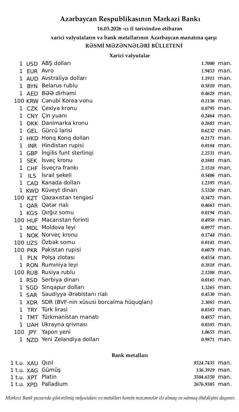 Rəsmi məzənnələr açıqlandı
