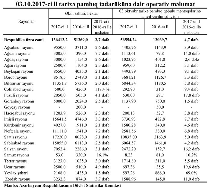 Dövlət Statistika Komitəsinin pambıq tədarükünə dair oktyabrın 3-dək olan operativ məlumatı.