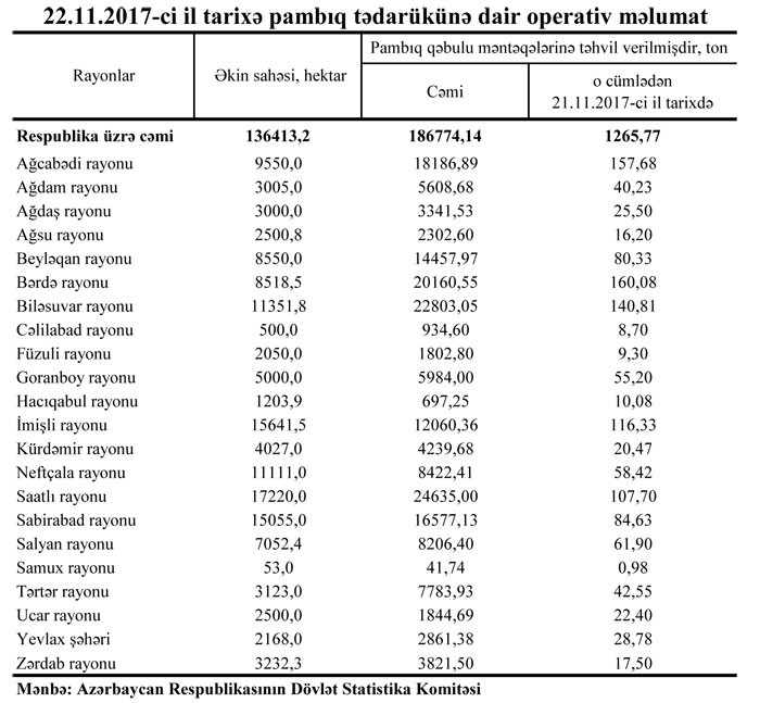 22.11.2017-ci il tarixə pambıq tədarükünə dair operativ məlumat