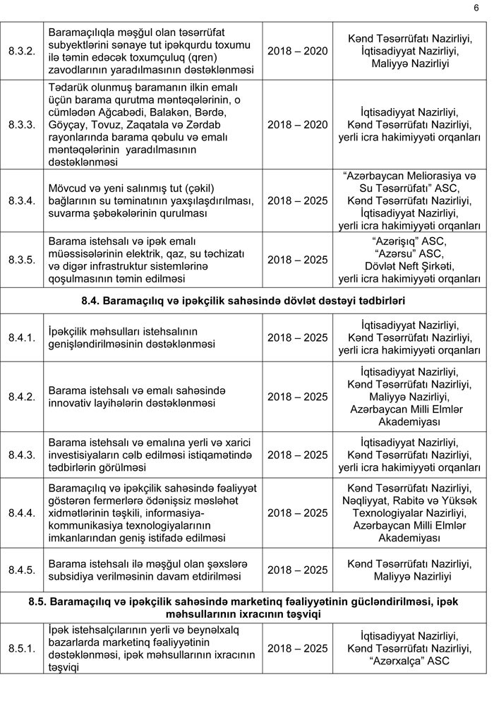 5.0. Azərbaycanda baramaçılığın və ipəkçiliyin inkişafı sahəsində qarşıya qoyulmuş məqsədlərə nail olmaq üçün aşağıdakı istiqamətlərdə zəruri işlərin görülməsi nəzərdə tutulur: