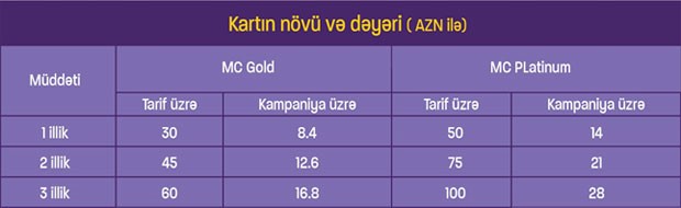 Məsələn, tarif üzrə qiyməti 100 manat olan üç illik MC Platinum kartını müştəri kampaniya müddətində cəmi 28 manat ödəməklə əldə edə bilər.