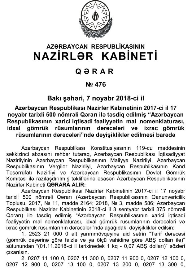 Qeyd edək ki, Qərara əsasən, bir sıra idxal kənd təsərrüfatı, ərzaq və tikinti sənayesi məhsullarının xüsusi gömrük rüsumlarının müddəti noyabrın 1-dən 2019-cu il dekabrın 15-dək uzadılır.