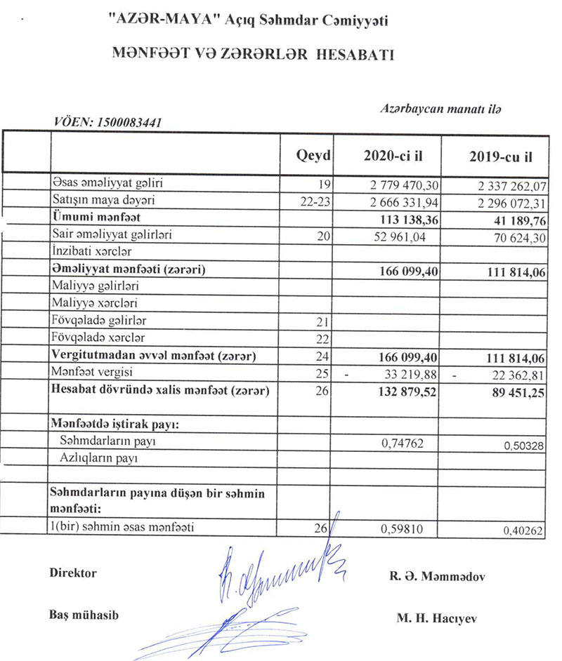 Qeyd edək ki, “Azər-Maya” ASC 2018-ci ildə 59 min manat, 2017-ci ildə 31 min manat, 2016-cı ildə 19 min manat, 2015-ci ildə isə 23 min manat xalis mənfəət əldə etmişdir.