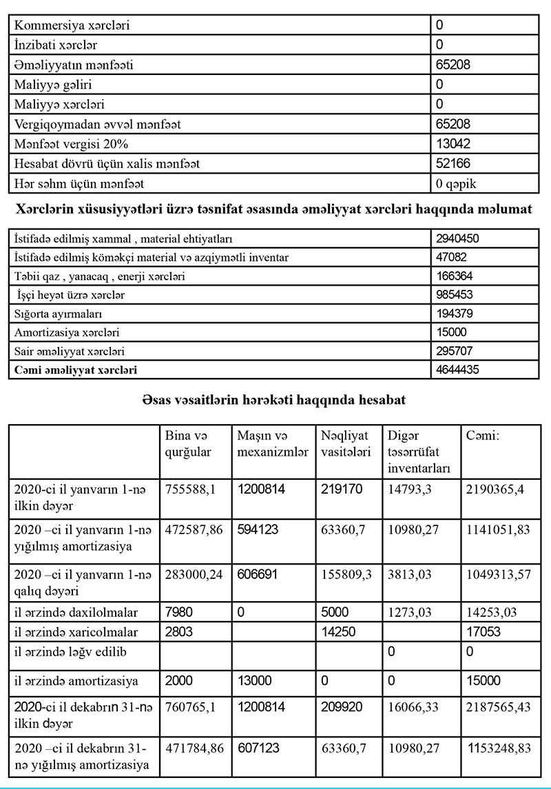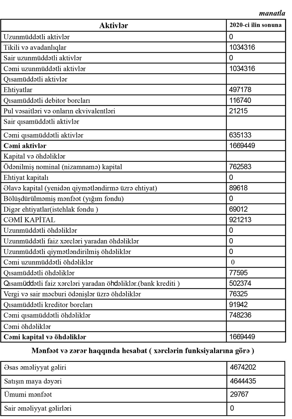 “SUMQAYIT-ÇÖRƏK” ASC-nin 2020-ci il dekabrın 31-nə mühasibat balansı
