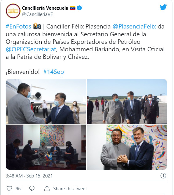 "Xarici işlər naziri Feliks Placencia, Neft İxrac Edən Ölkələr Təşkilatının Baş katibi Məhəmməd Barkindonu səmimi qarşıladı", - Marja xəbər verir ki, Xarici İşlər Nazirliyinin Twitter səhifəsində deyilir.