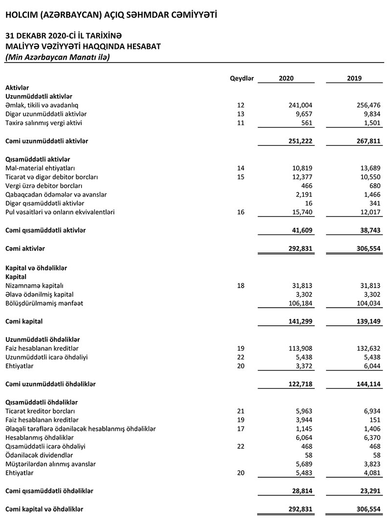 31 Dekabr 2020-ci il tarixində "Holcim Azərbaycan" 292 milyon 831 min manat cəmi aktivlərə malik olub. ASC 2019-cu ilin sonunda 306 milyon 554 min manat cəmi aktivlərə malik idi.