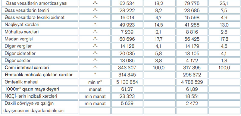 Qazın maya dəyərinin azalması keçən ilə nisbətən material xərclərinin, elektrik enerjisi xərclərinin, amortizasiya xərclərinin, mühafizə xərclərinin azalması hesabına baş vermişdir. Belə ki, material xərcləri 2 214 min manat (16,0%), elektrik enerjisi xərcləri 1 206 min manat (43,4%), amortizasiya xərcləri 17 241 min manat (21,6%), mühafizə xərcləri 1 577 min manat (17,9%), digər vergilər üzrə 51 min manat (0,4 %) azalmışdır.