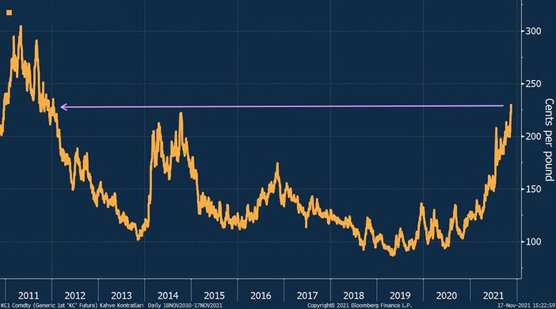 Qəhvə qiymətləri, 2021-ci ilin əvvəlindən bu yana təxminən 90% yüksələrək 10 ilin ən yüksək səviyyəsinə qalxıb.