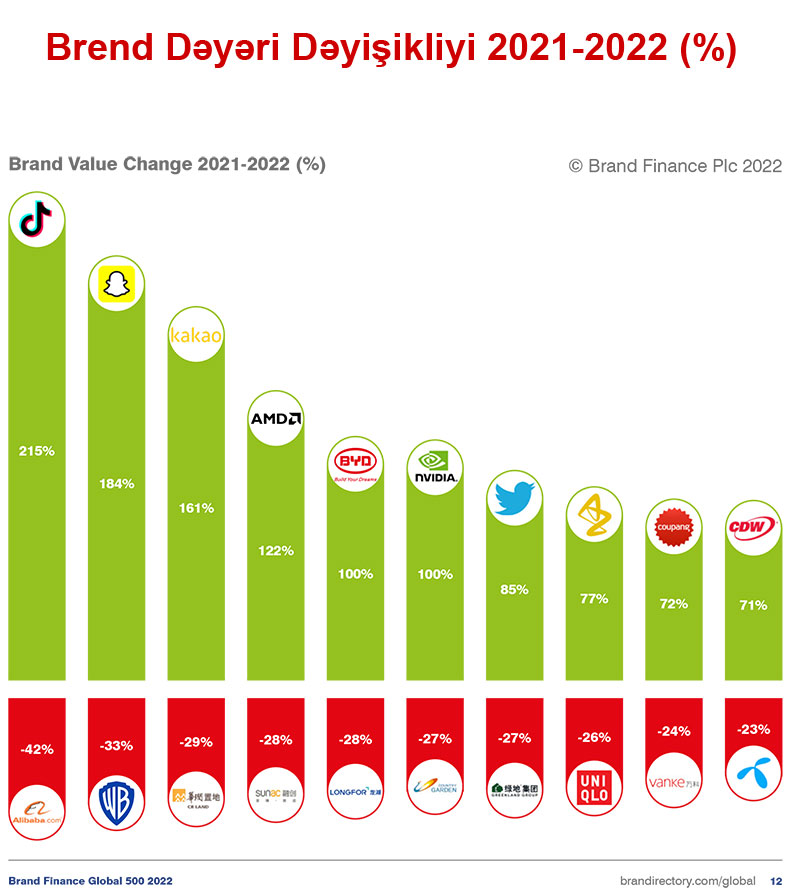 “Brand Finance” beynəlxalq reytinq agentliyi Dünyanın ən dəyərli və güclü brendlərinin illik hesabatını - “Qlobal 500-2022”ni dərc edib.