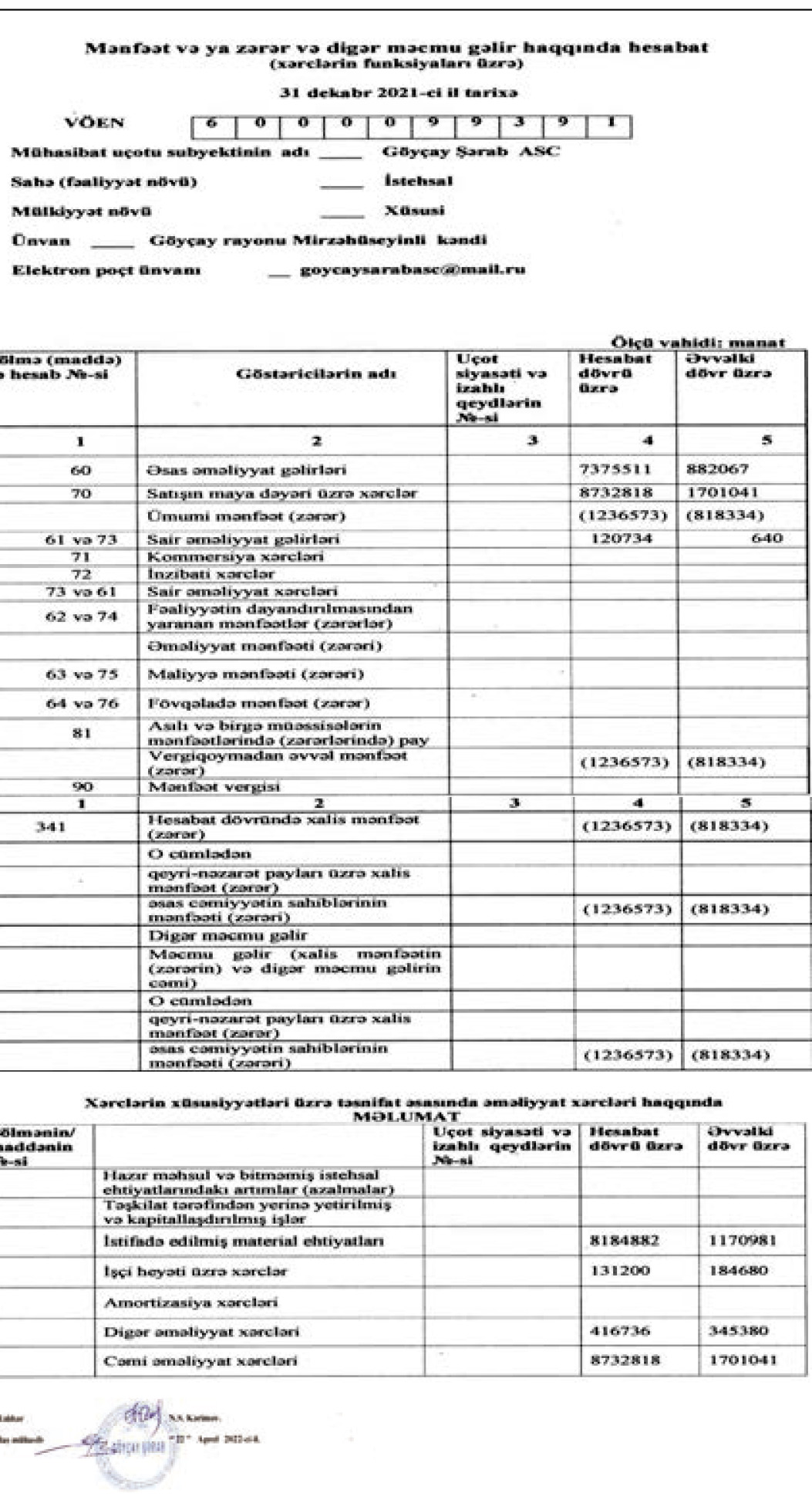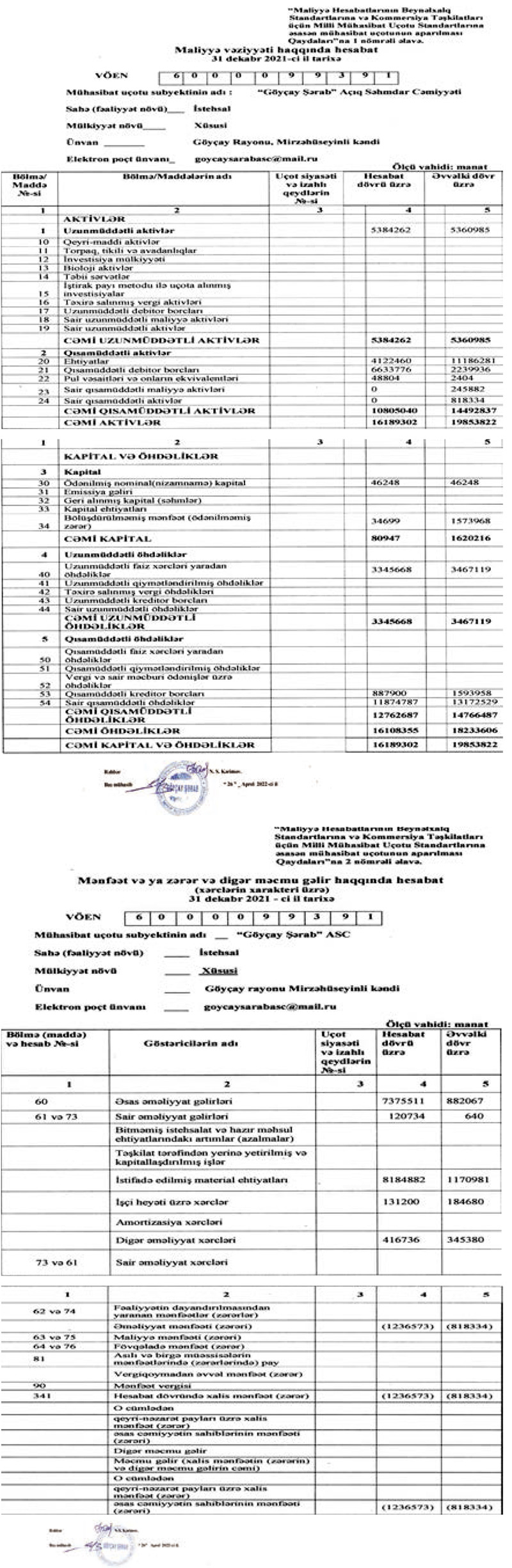 "Göyçay Şərab" ASC 2021-ci ili 1 milyon 237 min manat xalis zərər ilə başa vurub. Şirkət 2020-ci ili 818 min manat xalis zərər ilə bağlamışdı. Beləliklə, 2020-ci illə müqayisədə 2021-ci ildə "Göyçay Şərab"ın xalis zərəri 51,2% artıb.