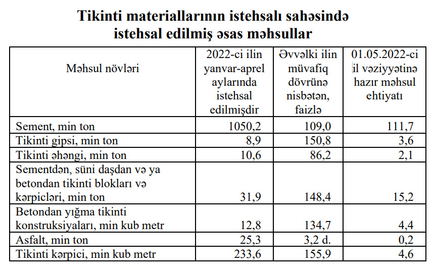 2022-ci ilin yanvar-aprel aylarında Azərbaycanda 1 milyon 50,2 min ton sement istehsal edilib.