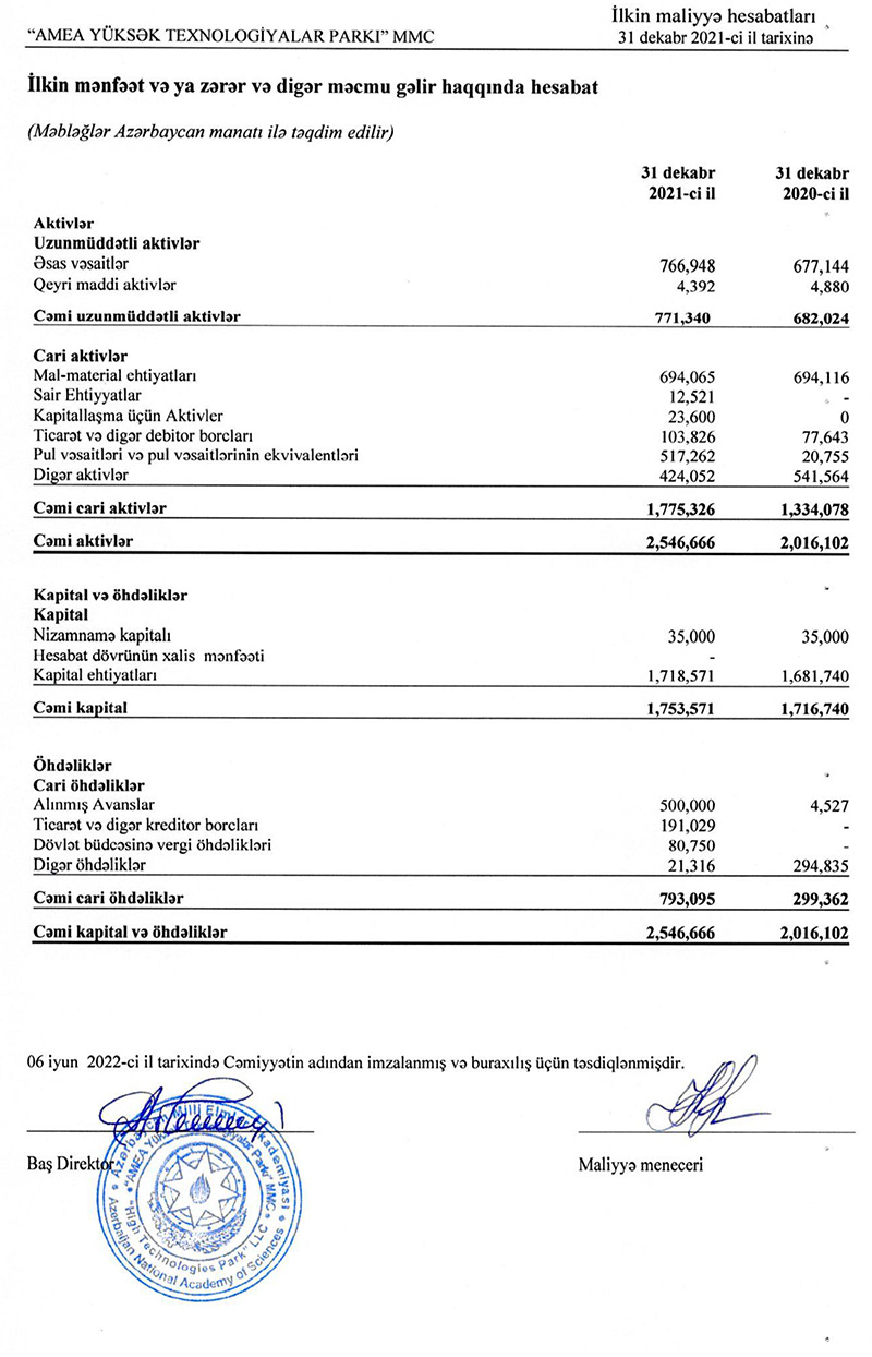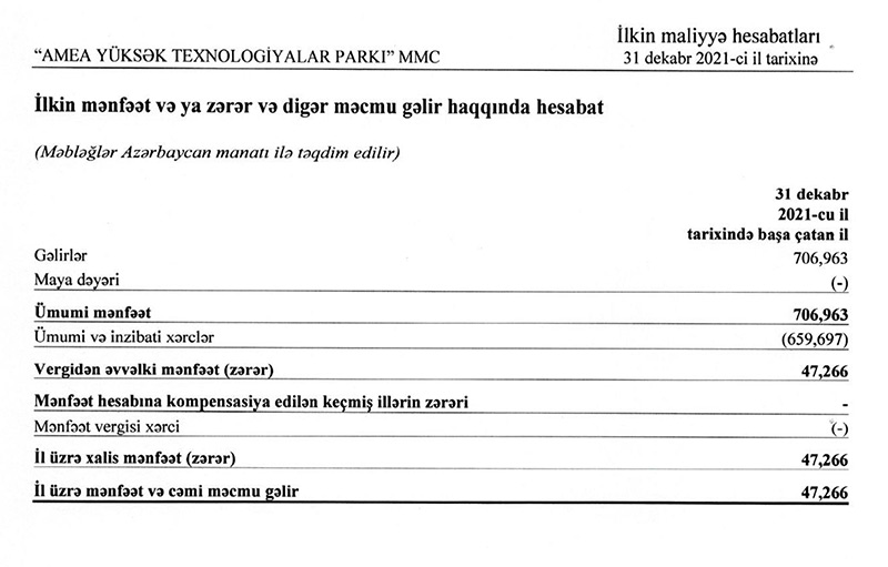 “AMEA Yüksək Texnologiyalar Parkı” MMC 2021-ci ili 47 min 266 manat xalis mənfəət ilə başa vurub. MMC 5 illik fəaliyyəti ərzində ilk dəfə olaraq maliyyə ilini mənfəətlə başa vurub.