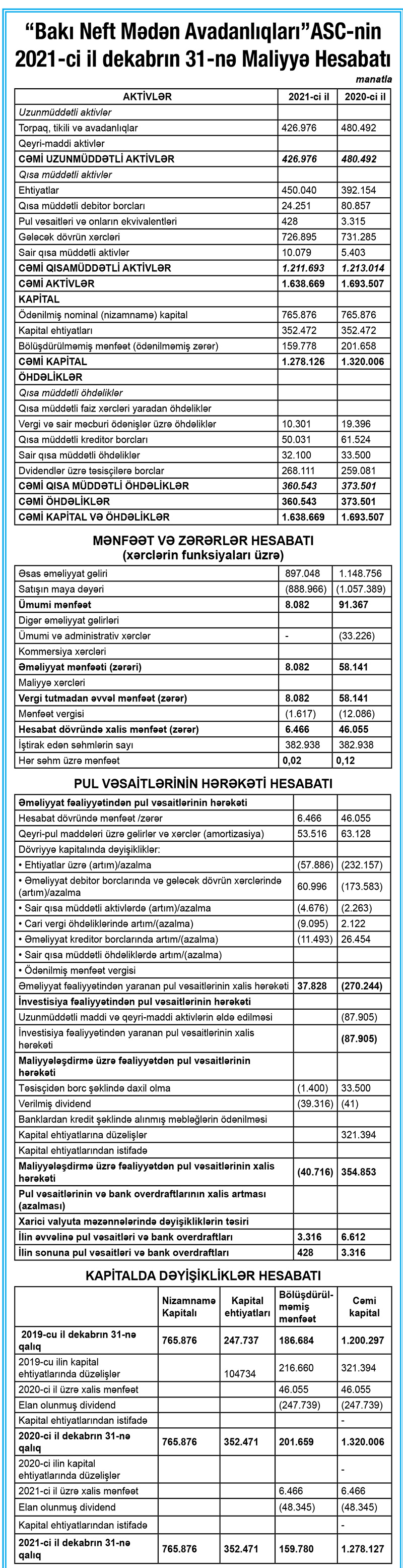 31 Dekabr 2021-ci il tarixində “Bakı Neft Mədən Avadanlıqları” ASC 1 milyon 638 min 69 manat cəmi aktivlərə malik olub.