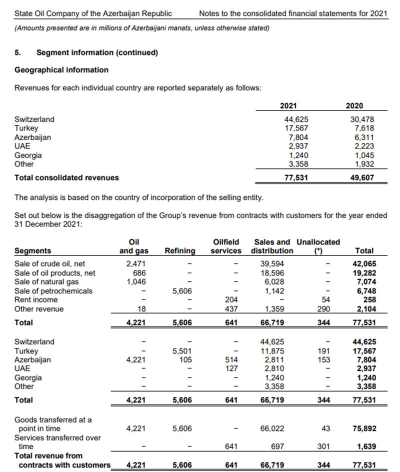 SOCAR 2021-ci ildə satışdan 77 milyard 531 milyon manat gəlirlərinin 44 milyard 625 milyon manatını İsveçrədə, 17 milyard 567 milyon manatını Türkiyədə, 7 milyard 804 milyon manatını Azərbaycanda, 2 milyard 937 milyon manatını Birləşmiş Ərəb Əmirliklərində, 1 milyard 240 milyon manatını Gürcüstanda, 3 milyard 358 milyon manatını digər ölkələrdə əldə edib.