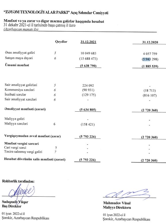 2021-ci ildə "Zəyəm Texnologiyalar Parkı"nın cəmi gəlirləri 10 milyon 274 min manat, cəmi xərcləri isə 16 milyon 67 min manat təşkil edib. "Zəyəm Texnologiyalar Parkı"nın xərcləri gəlirlərini üstələdiyindən ötən ili 5 milyon 793 min manat xalis zərər ilə başa vurub. Müqayisə üçün qeyd edək ki, 2020-ci ildə Şirkətin cəmi gəlirləri 4 milyon 58 min manat, cəmi xərcləri 6 milyon 778 min manat, xalis zərəri isə 2 milyon 720 min manat təşkil etmişdi.