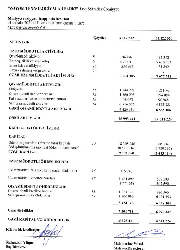 "Azmade Group" şirkətinə daxil olan, metaldan tikinti konstruksiyalarının istehsalı ilə məşğul olan "Zəyəm Texnologiyalar Parkı" ASC 2021-ci il üzrə maliyyə göstəricilərini açıqlayıb.