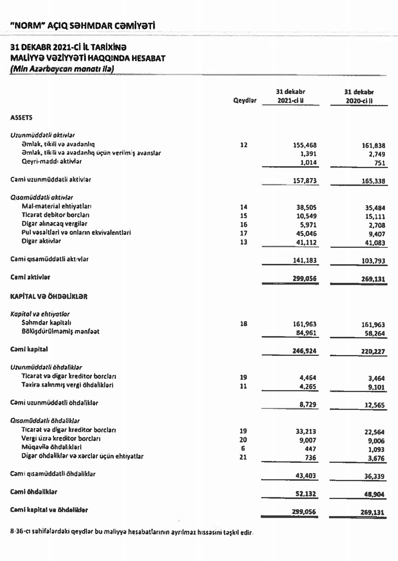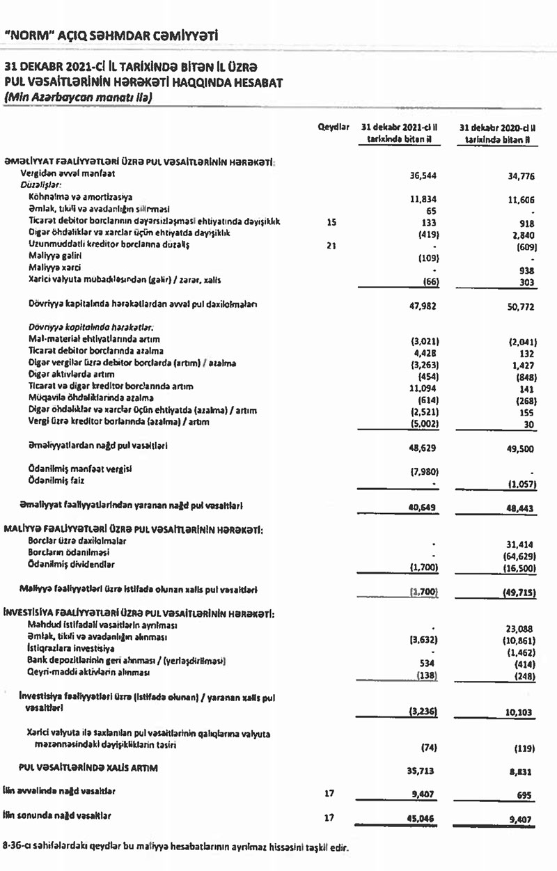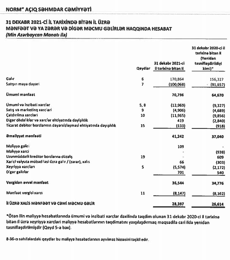 Marja xəbər verir ki, 2020-ci ildə "Norm" şirkətinin satışdan gəlirləri 156 milyon 327 min manat manat ikən, 2021-ci ldə 170 milyon 864 min manata yüksəlib (14 milyon 537 min manat və ya 9,3% artıb).
