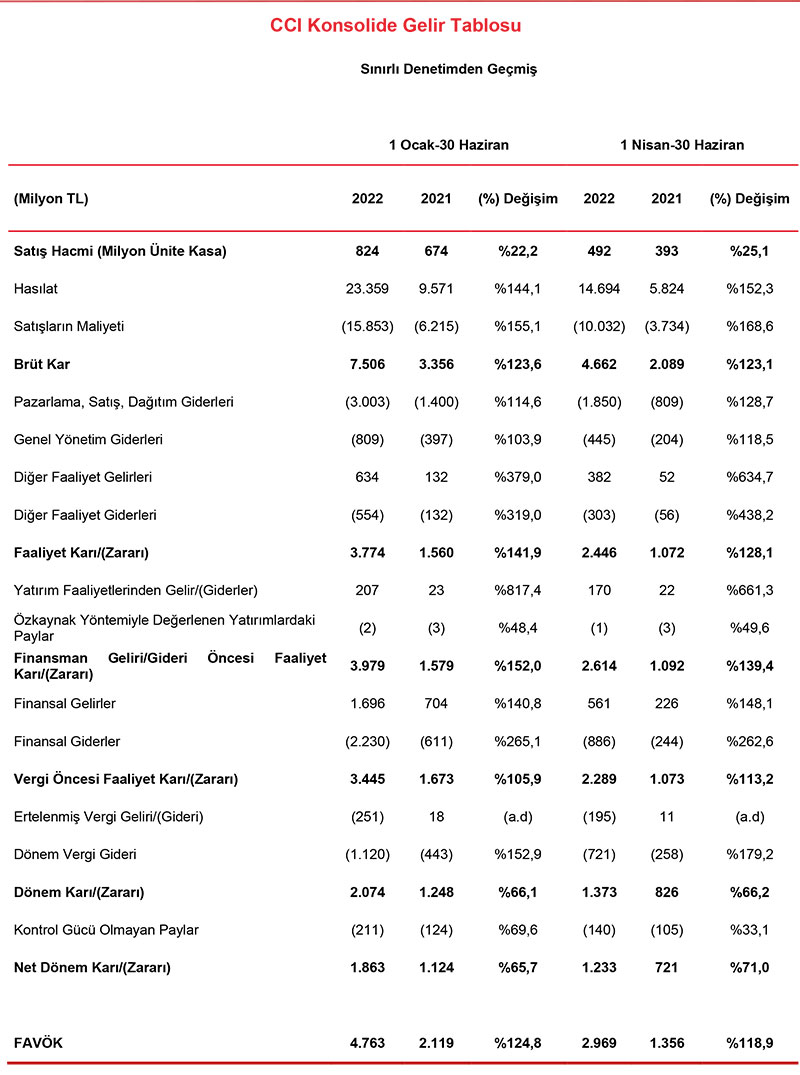 Marja.az şirkətin məlumatına istinadən xəbər verir ki, "Coca-Cola İçecek" 2022-ci ilin ikinci rübündə 1 milyard 233 milyon Türk Lirəsi (TL) xalis mənfəət əldə edib. Bu, bazar proqnozuna uyğundur. Xalis mənfəət əvvəlki ilin ikinci rübü ilə müqayisədə 71 faiz artıb. Şirkətin ilin ilk yarısında (yanvar-iyunda) xalis mənfəəti ötən ilin eyni dövrü ilə müqayisədə 65,7% artaraq 1 milyard 863 milyon TL-yə çatıb.