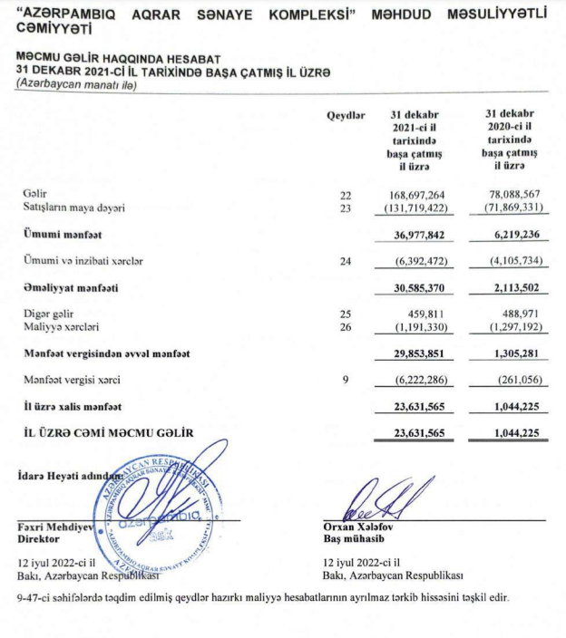 "Azərbaycan Sənaye Korporasiyası" ASC-yə tabe olan “Azərpambıq Aqrar Sənaye Kompleksi” MMC 2021-ci ili 23 milyon 632 min manat xalis mənfəət ilə başa vurub. Halbuki, şirkət 2020-ci ili 1 milyon 44 min manat xalis mənfəət ilə bağlamışdı. Beləliklə, 2020-ci illə müqayisədə 2021-ci ildə “Azərpambıq Aqrar Sənaye Kompleksi”nin xalis mənfəəti 23 dəfəyə yaxın artıb.