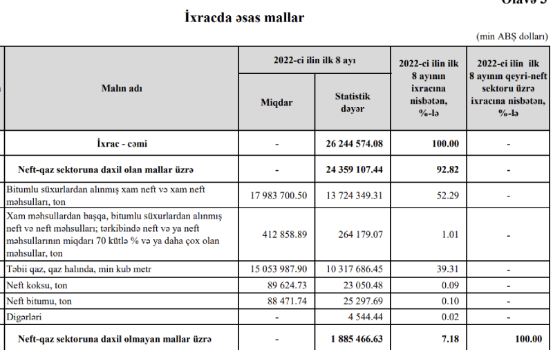 Həmçinin, 2022-ci ilin 8 ayı ərzində Azərbaycandan ixrac edilmiş neft-qaz sektoruna daxil olmayan mallar üzrə ixrac 1 milyard 885 milyon 466 min dollar təşkil edib (ötən ilin eyni dövründə 1 milyard 584 milyon 468 min dollar təşkil etmişdi).