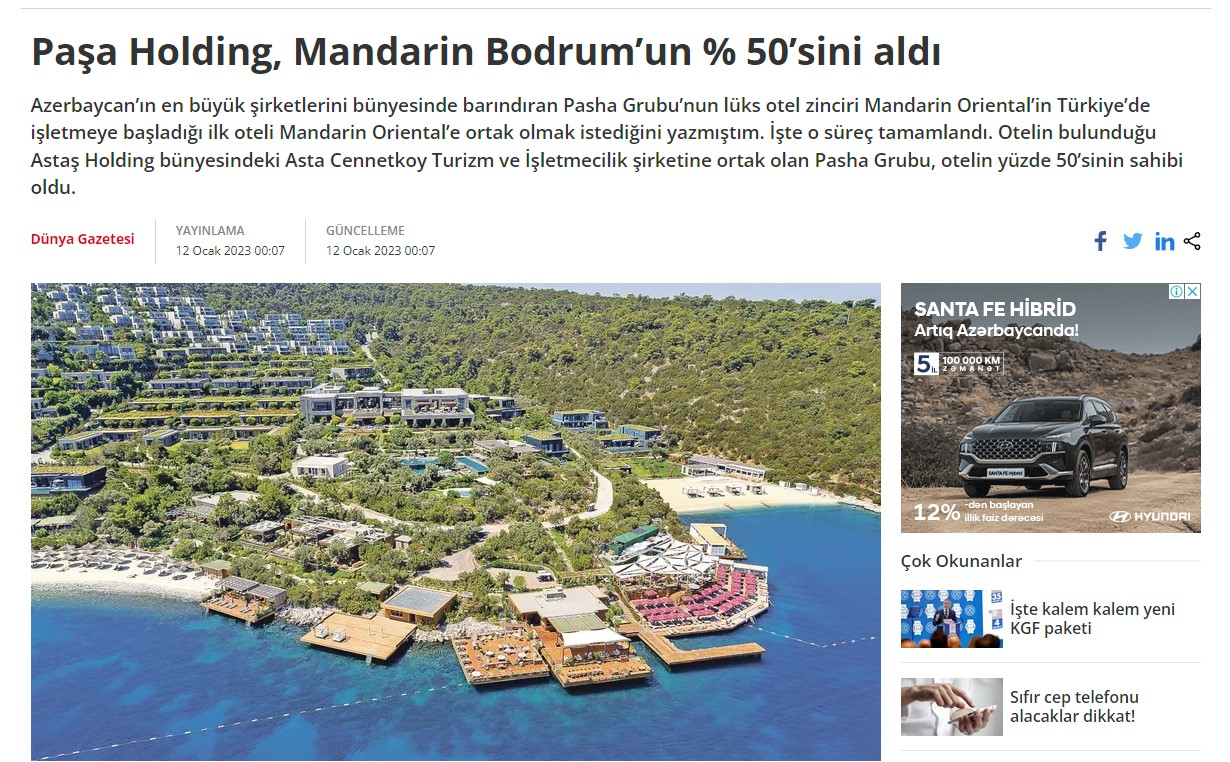 "PAŞA Holdinq" "Mandarin Oriental Bodrum"un 50%-ni alıb.Azərbaycanın iri holdinqi "PAŞA Holding", lüks otellər şəbəkəsi "Mandarin Oriental"ın Türkiyədəki ilk oteli olan "Mandarin Oriental Bodrum"a ortaq olub.