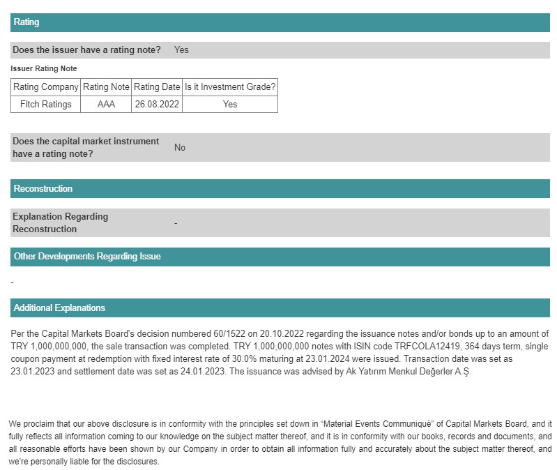 "Coca-Cola İçecek AŞ" 1 milyard Türk lirəsi (TL) məbləğində (cari məzənnə ilə 90 milyon 400 min manat ) istiqrazlar buraxıb.