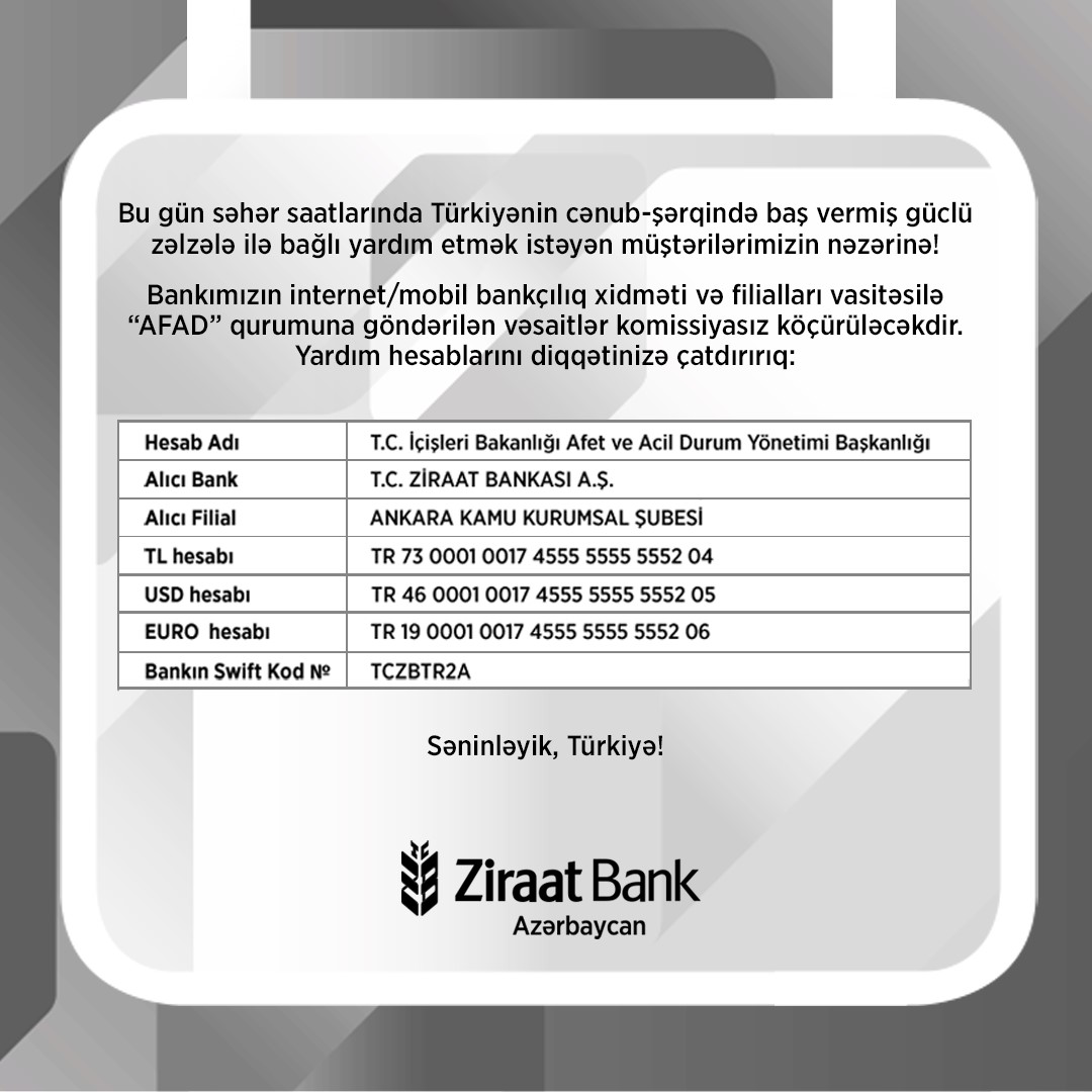 Bankın məlumatında bildirilir ki, Bank baş vermiş təbii fəlakətlə bağlı Türkiyənin Daxili İşlər Nazirliyinin Təbii Fəlakət və Fövqəladə Hallar Agentliyinə (AFAD) yardım köçürmələrinin komissiyasız icra edilməsi haqqında qərar qəbul etmişdir. Bankdan əldə edilən məlumata əsasən, təbii fəlakət nəticəsində zərər çəkənlərə yardım etmək istəyən müştərilər Bankın Mobil Bankçılıq tətbiqi, İnternet Bankçılıq platforması üzərindən və ya filiallarına yaxınlaşaraq aşağıdakı hesablara köçürmələri komissiyasız həyata keçirə bilərlər: