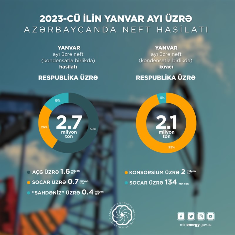 2023-cü ilin yanvar ayında ölkədə 2,7 milyon ton neft (kondensatla birlikdə) hasil edilib. Respublika üzrə neft hasilatının 1,6 milyon tonu “Azəri-Çıraq-Günəşli”nin, 0,4 milyon tonu (kondensat) “Şahdəniz”in payına düşüb. SOCAR üzrə neft (kondensatla birlikdə) hasilatı 0,7 milyon ton təşkil edib.