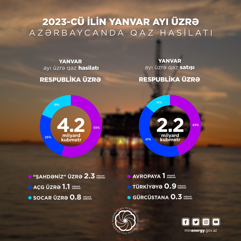 2023-cü ilin ilk ayında ölkədə 4,2 milyard kubmetr təbii qaz hasil edilib2023-cü ilin yanvar ayı üzrə operativ məlumatlara əsasən, ötən ay Azərbaycanda 4,2 milyard kubmetr təbii qaz hasil edilib. Qazın 1,1 milyard kubmetri “Azəri-Çıraq-Günəşli”dən, 2,3 milyard kubmetri “Şahdəniz”dən, 0,8 milyard kubmetri SOCAR üzrə hasil olunub. 2022-ci ilin müvafiq dövrünə nisbətən 4 faiz, yəni 162 milyon kubmetr artımla qaz hasil edilib.